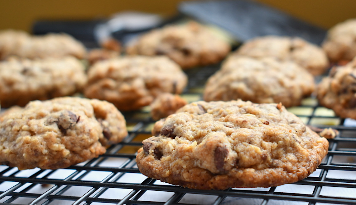 - In a separate bowl, mix together flour, oatmeal, salt, baking powder, baking soda. Mix together all ingredients. Then add the chocolate chips, walnuts and grated chocolate bar. Add the dry ingredients to the wet ingredients and mix until fully incorporated. Bake on ungreased cookie sheet. Make even golf size cookies and space them 2" apart. Put them into a 375 degree F preheated oven and bake for 6 minutes. This recipe should yield 112 cookies.