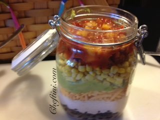 I substituted the refried beans with black beans and I used a peach-mango salsa. I also modified the quantities to fit inside a 3″ mason jar. I love this mason jar with the attached self sealing lid. I also purchased the salsa and guacamole for ease of preparation.