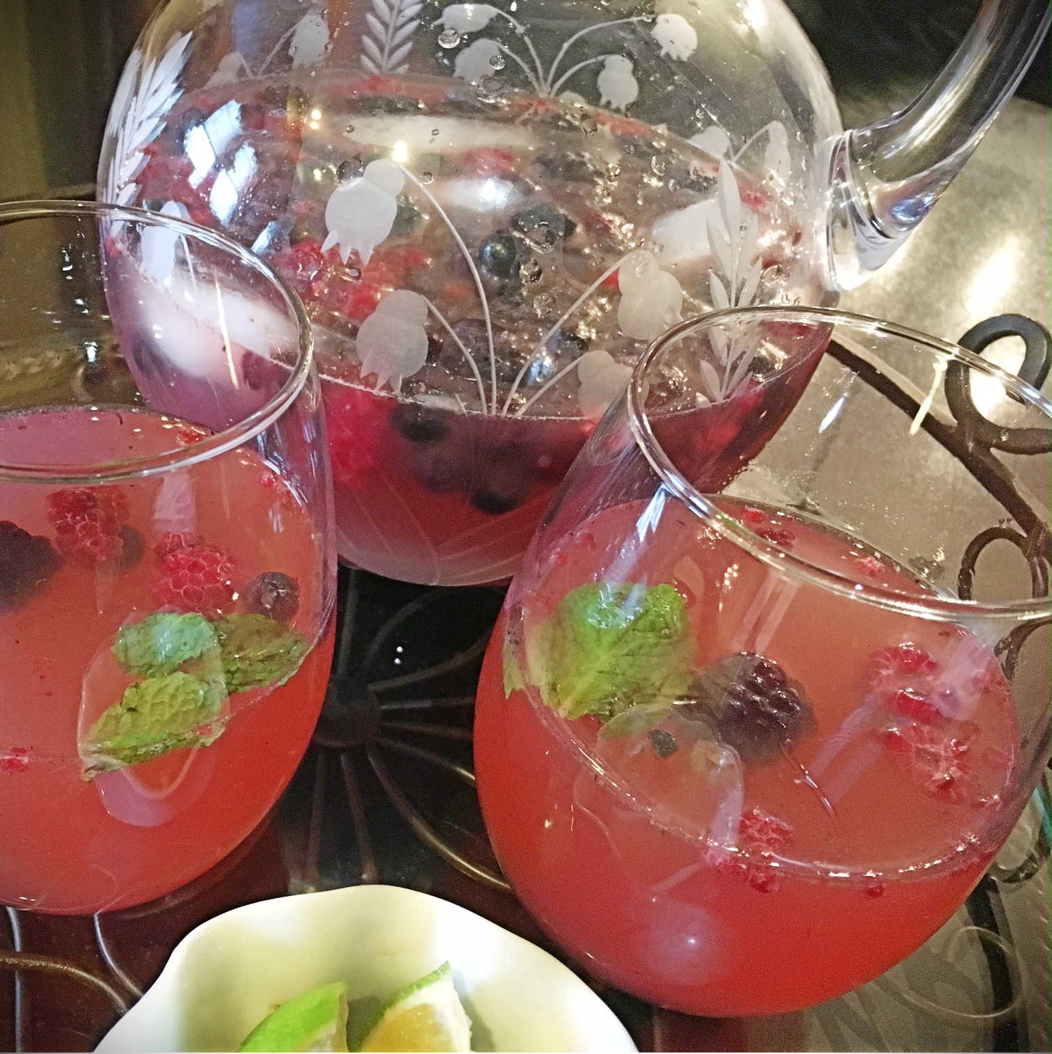 - In a pitcher mix together blood orange soda and white wine with triple sec. Stir with a spoon. Add fresh mint and lime. Add the frozen berries right before serving.
