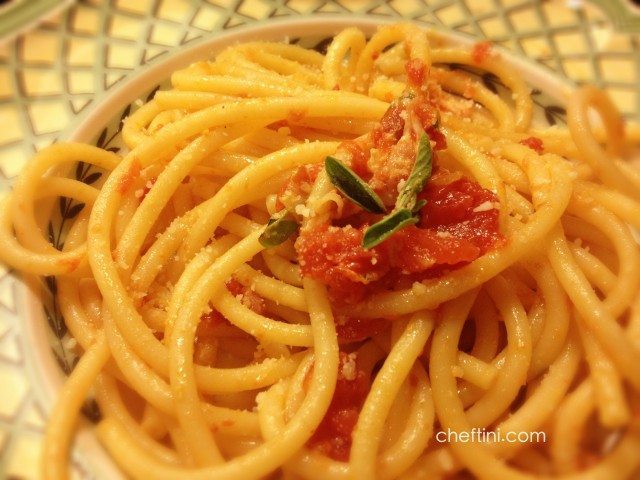 - Add the pancetta to the pan, cook another minute and then add the oregano. Drain your pasta when it reaches the desired doneness. I like it al dente – with a little bite. Remember to reserve a 1/2 cup of liquid before discarding. If you like the sauce a little thinner then you can gradually add the reserved cooking liquid. Add the pasta to the pan, coat through the sauce, and sprinkle with grated cheese.