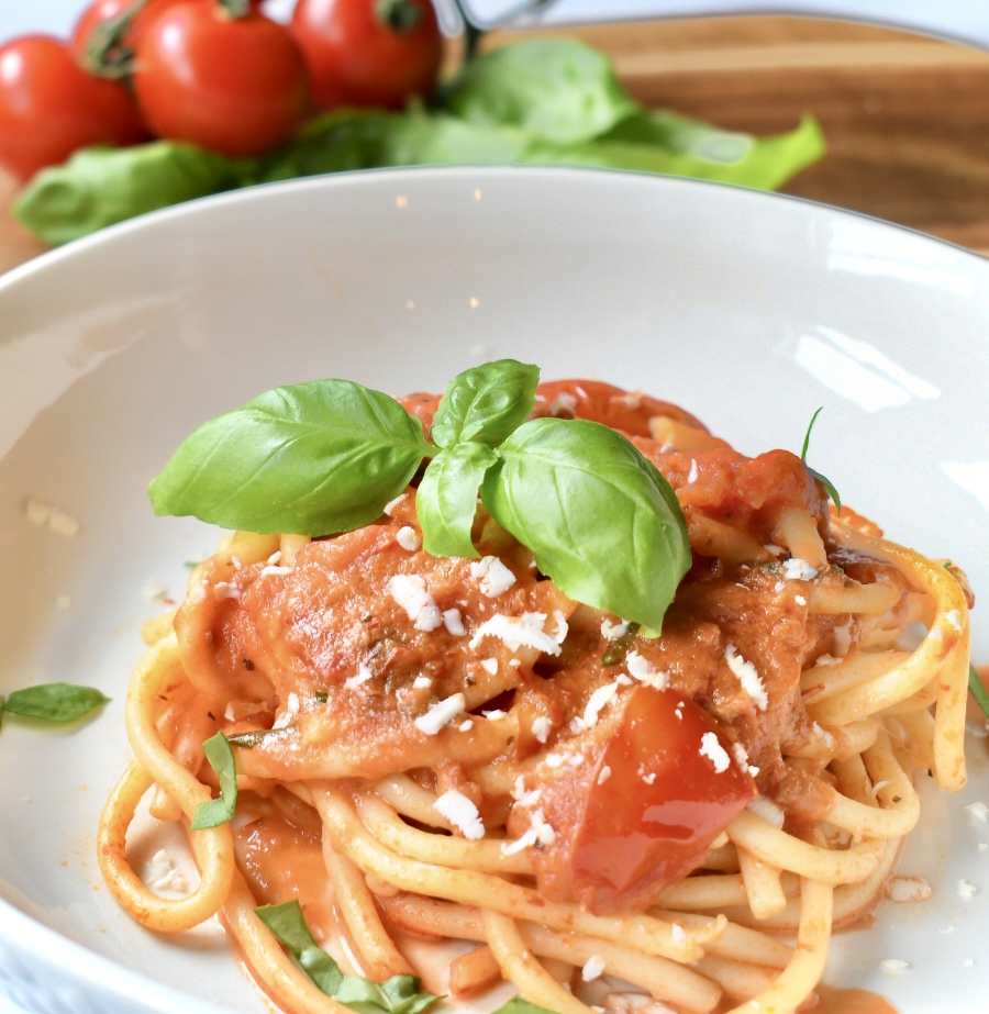 I always say a well stocked pantry and fridge go a long way. With just simple basics on hand, I feel like I can always pull something together. And now the next time you are in a pinch for dinner, you can grab this recipe for Bucatini Pomodoro and pull it together too!
