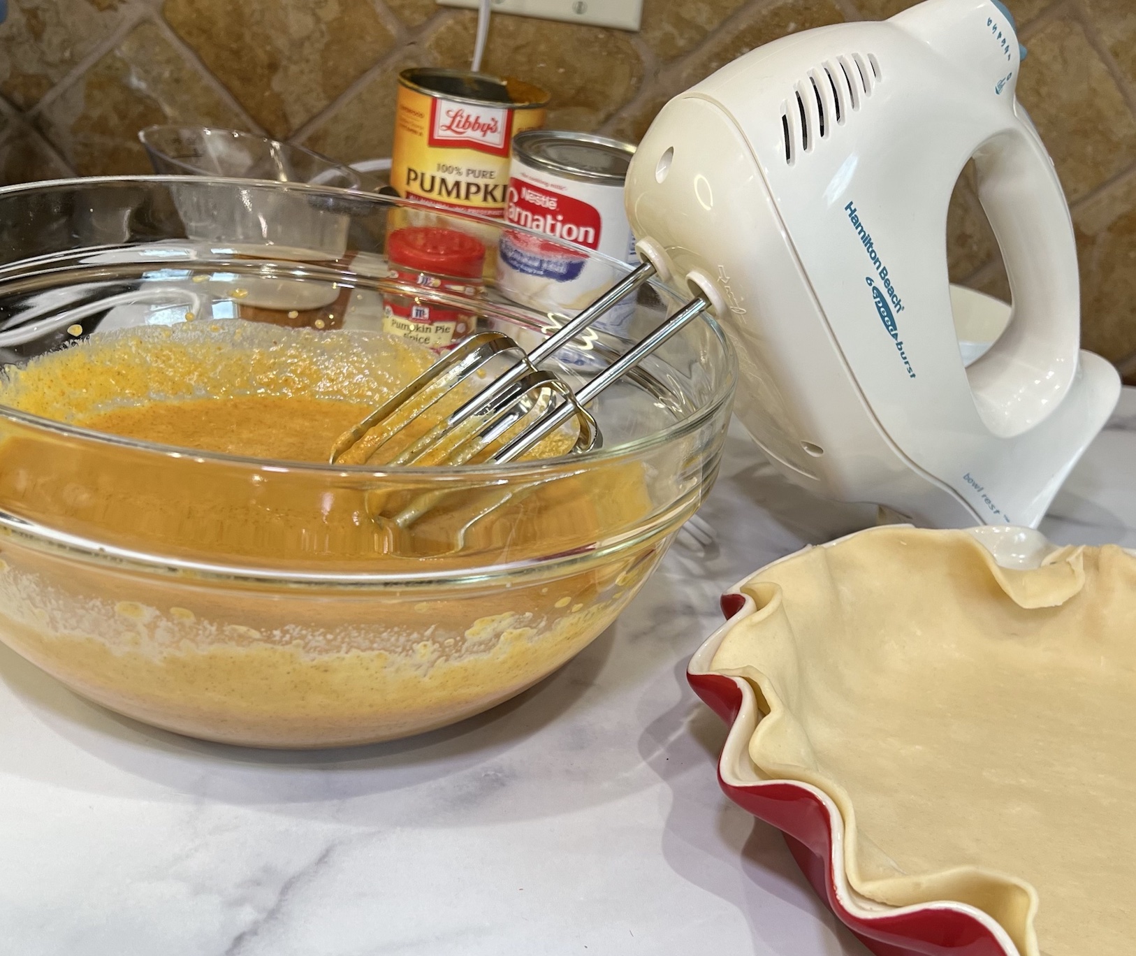 - Beat eggs slightly with a hand mixer. Then add pumpkin puree, sugar, salt, spices and evaporated milk. Mix until smooth and creamy.
