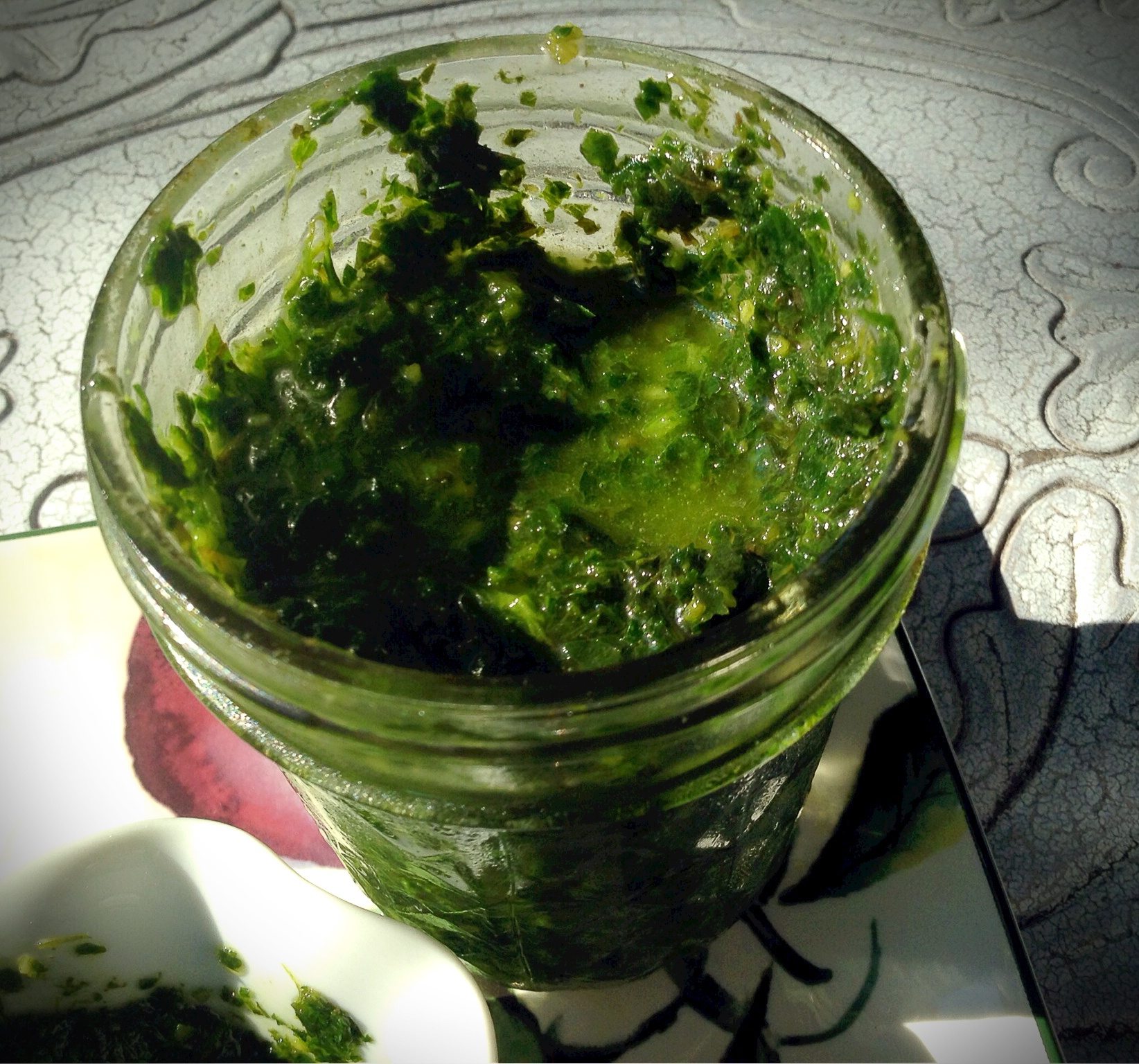 What’s a green sauce? I’m not sure what the technical term of “Italian Green Sauce” is, but to me it is NOT a pesto since it has no nuts or cheese. What I do know is every summer my mother would take our garden herbs – basil, parsley, and sometimes even mint – and blend them together with olive oil and garlic. She would put the sauce into little jars that lined the inside door of our refrigerator. She called it a green sauce and would use it as a base for sauces like pesto, just put a touch in sauces for freshness, and even as a seasoning on potatoes and other vegetables.