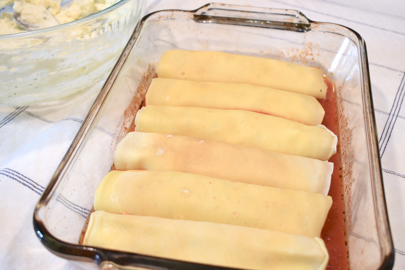 When all the manicotti you need are rolled, they are ready to be layered into a baking dish.