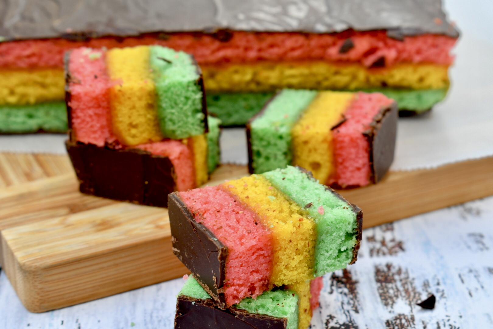 Italian Rainbow Cookies, also known as Tri-Color Cookies, are a delightful treat made up of three layers of almond cookie, with jelly sandwiched in between and a chocolate coating on the top and bottom (sometimes just on the top). Commonly referred to as tri-color cookies among Italian Americans, they often resemble the colors of the Italian flag: red, white, and green. Growing up, we called them tri-color cookies, but over time, they’ve also been affectionately dubbed rainbow cookies and even seven-layer cookies.