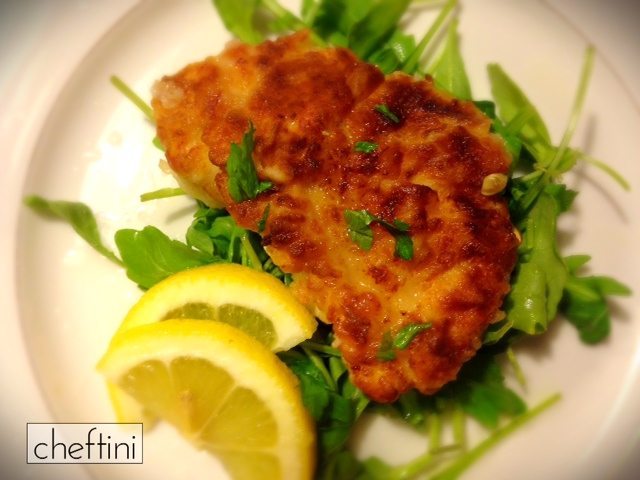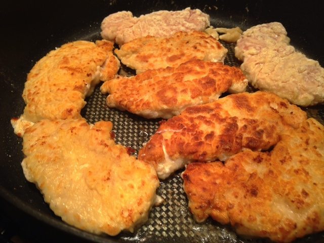 It’s a thin piece of chicken coated in milk, parmesan and flour.