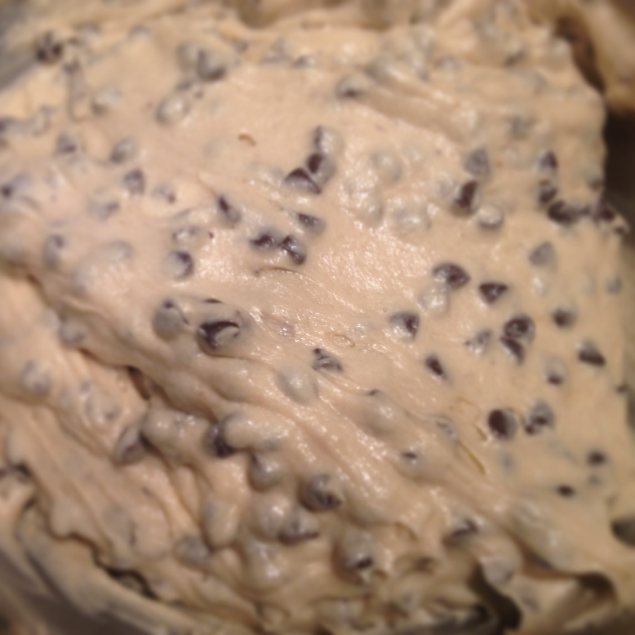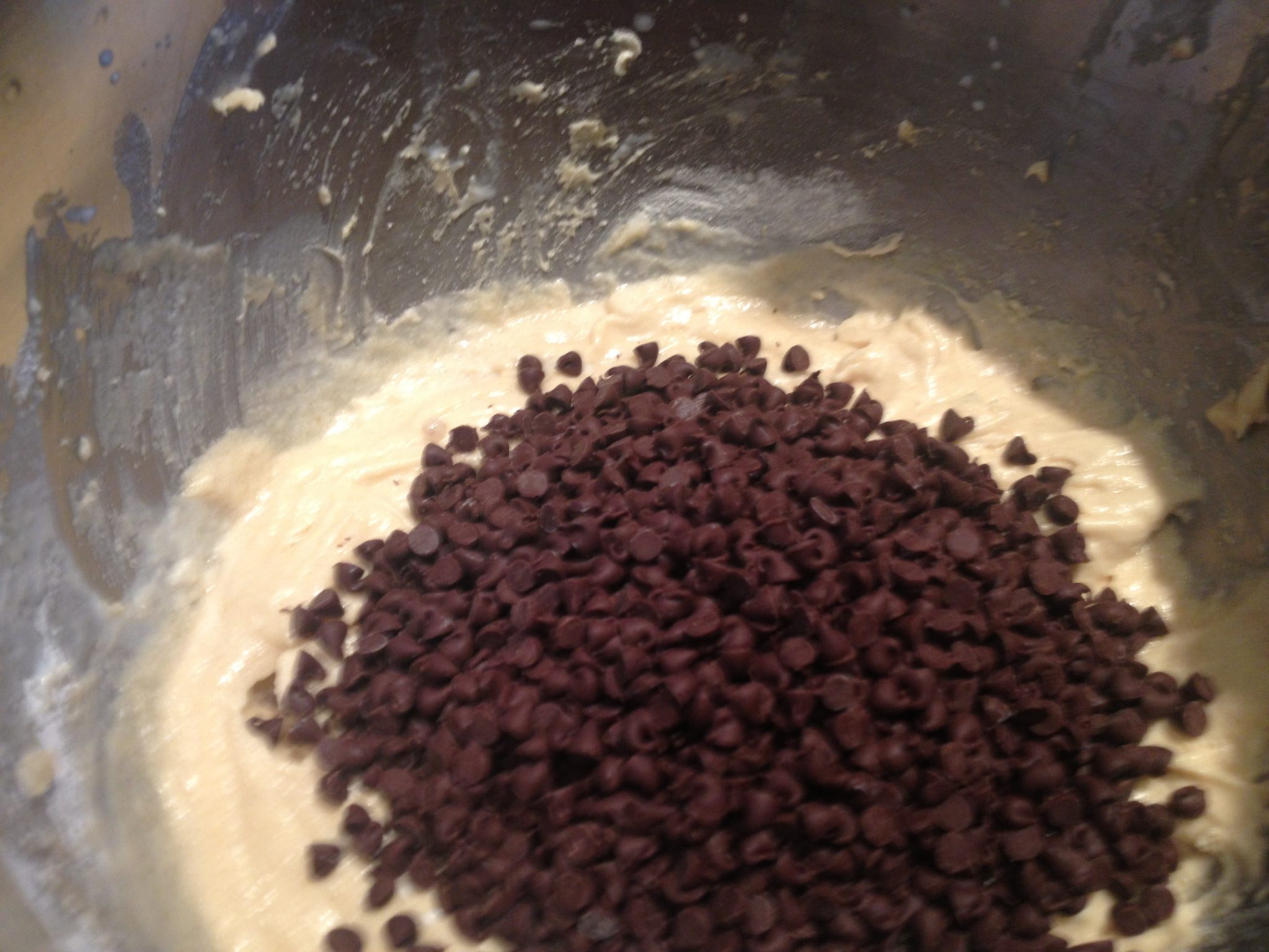 - Sift together flour, salt, baking powder and baking soda. In a mixing bowl beat the brown and granulated sugars with butter on medium heat until light and fluffy. Add the eggs and blend well. Alternate adding the flour and milk. Mix well in between each addition. When mixed well fold in the mini chocolate chips.