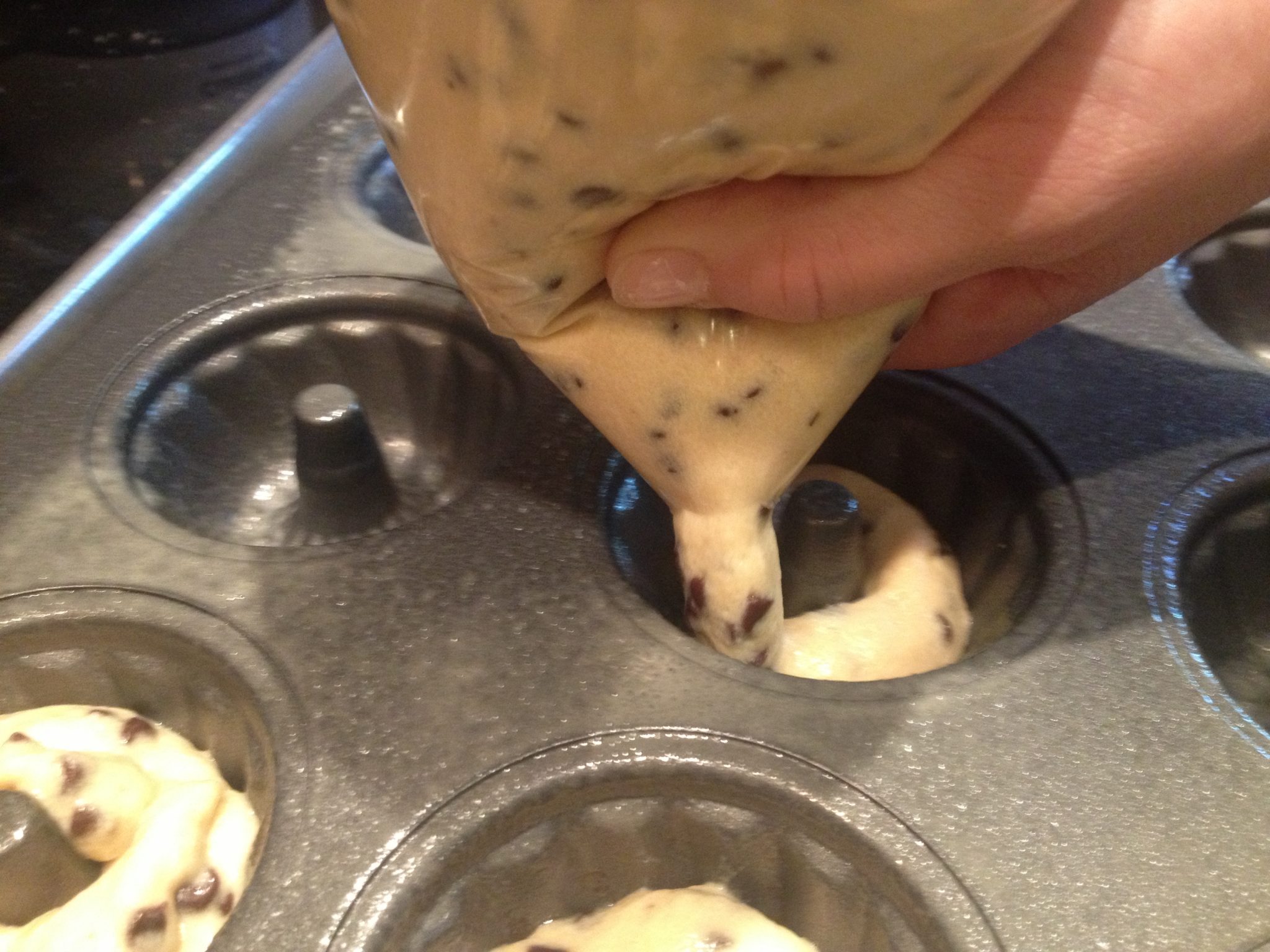 TIP: For a little less mess you can place the batter into a self sealing plastic bag like I do. I prefer this method. My husband helped me hold the bag while I filled it with batter, but if you don’t have a sioux chef like me, then you can place the ziplock into a tall cup and fold it over the rim of a glass…..