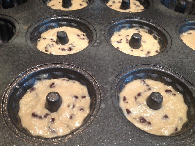 - Spoon the batter into the mini bundt pan wells and fill about 3/4 full (even a little less is better).