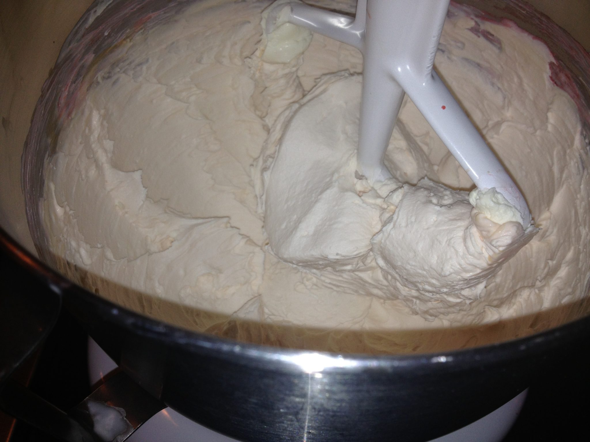 - Mixed together the softened cream cheese, heavy cream and vanilla… (I used the paddle attachment on my kitchen aide but had to go back with the whisk to smooth out – next time I would use the whisk attachment on the kitchen aide)