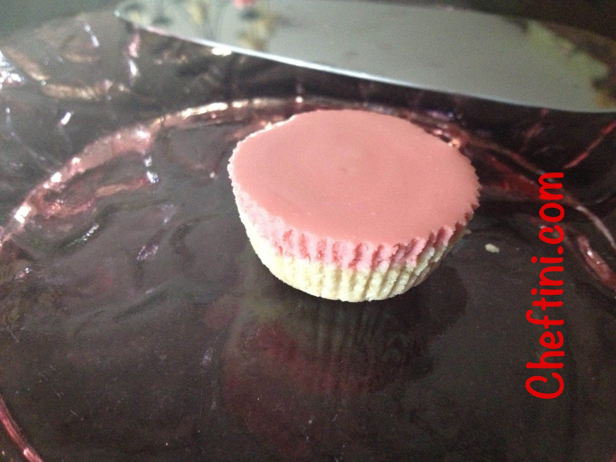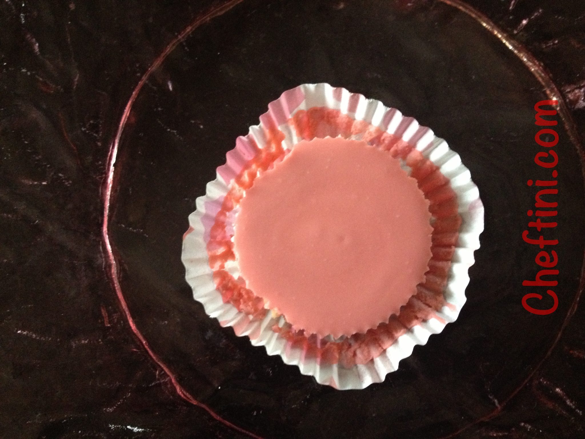 - Squezzed a dollop onto each cheesecake and placed a cherry on the top. I cut the cherries into 1/4’s ( I used whole country style cherries and then cut them).