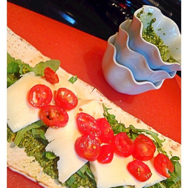 What do you have for lunch on a lazy rainy saturday? This past weekend we had this amazing Mozzarella Caprese Arugula with Walnut Pesto Wrap.