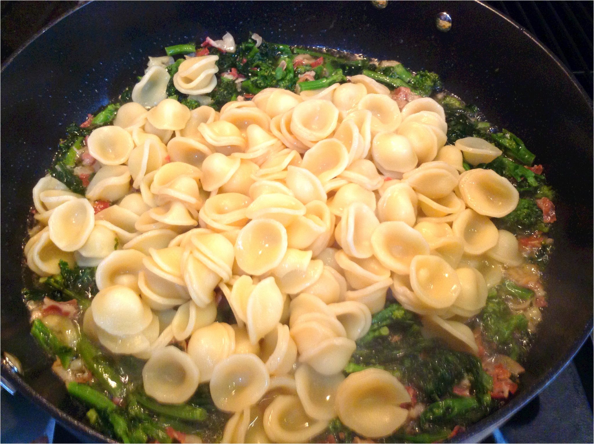 - 4. After combining the pancetta with the broccoli di rabe add white wine and stock. Bring to a simmer. Drain the pasta and add to the simmering sauce.