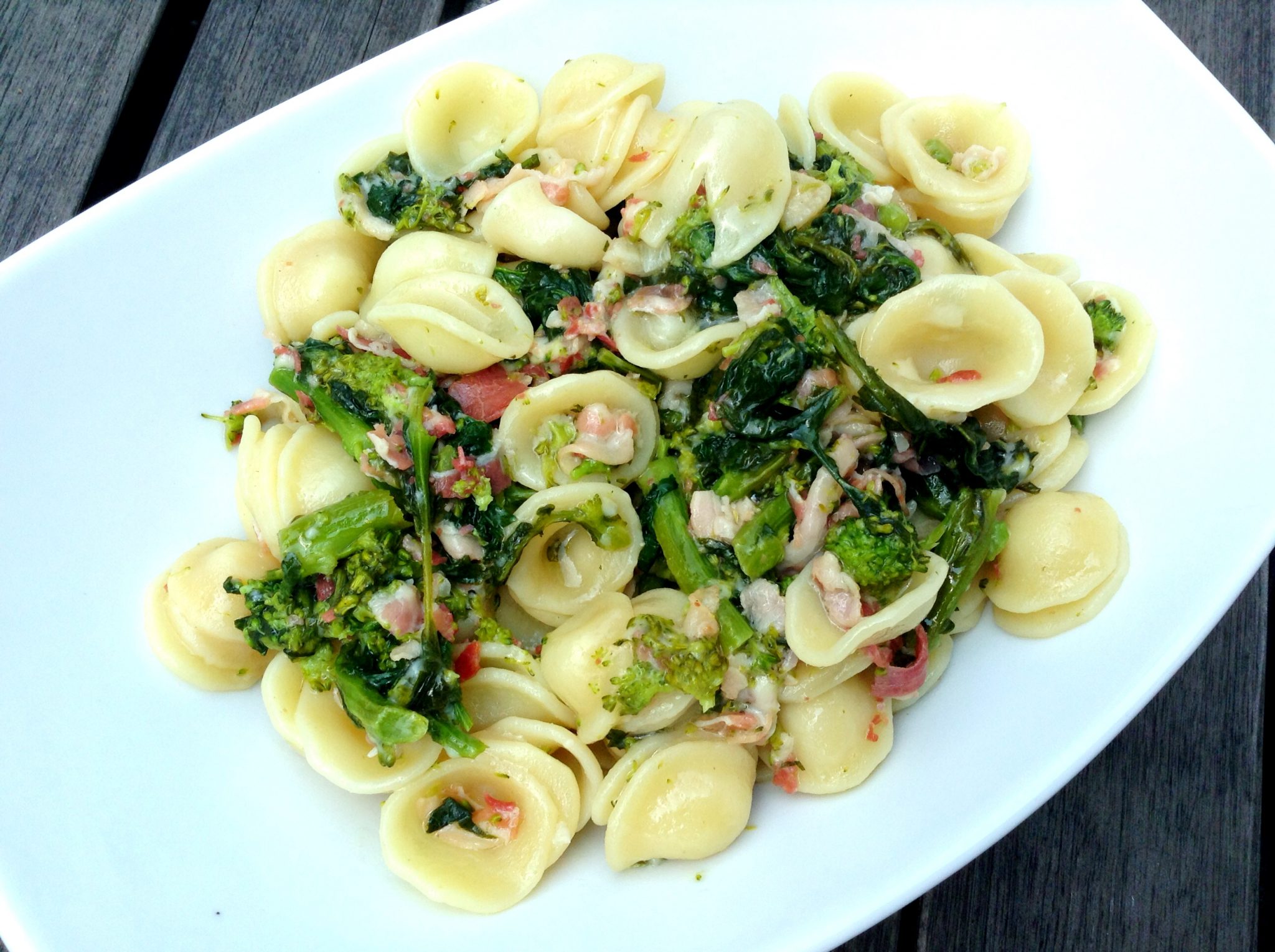 Ok pasta lovers, are you ready to take a break from your favorite red sauce? Hopefully you are, because here goes one of my all time favorite dishes: Orecchiette with Pancetta and Broccoli di rabe. This dish is packed with great flavor and is a great alternative to traditional pasta with sauce. It does take a few more steps to get it all done, but in the end, I actually think this is an easier dish to master than homemade tomato sauce.