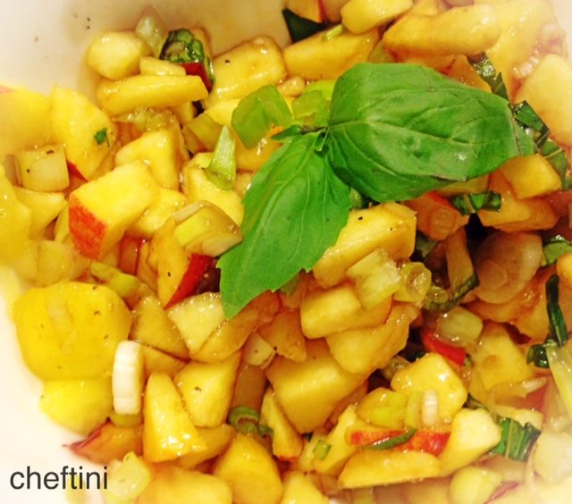 In the meantime begin to prepare your peach relish. Which is a simple mix of diced peaches, chopped scallions, chopped basil, balsamic vinegar, and black pepper.