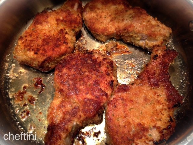 Once coated heat your oven to 400 degrees F. Then begin to heat vegetable oil (I use olive oil) in a large oven proof sauté pan and sear the chops on both sides. Once seared place into the hot oven and cook until done. About 20 minutes or until the pork chops reach an internal temperature of 160 degrees.