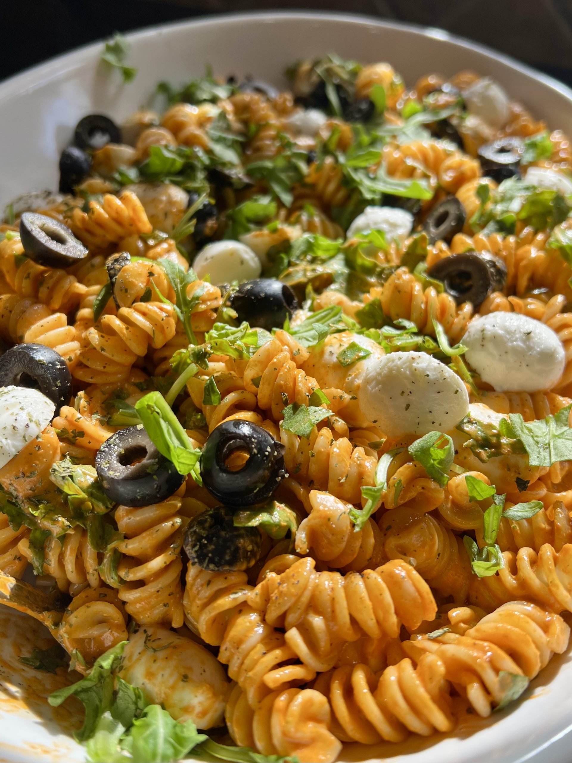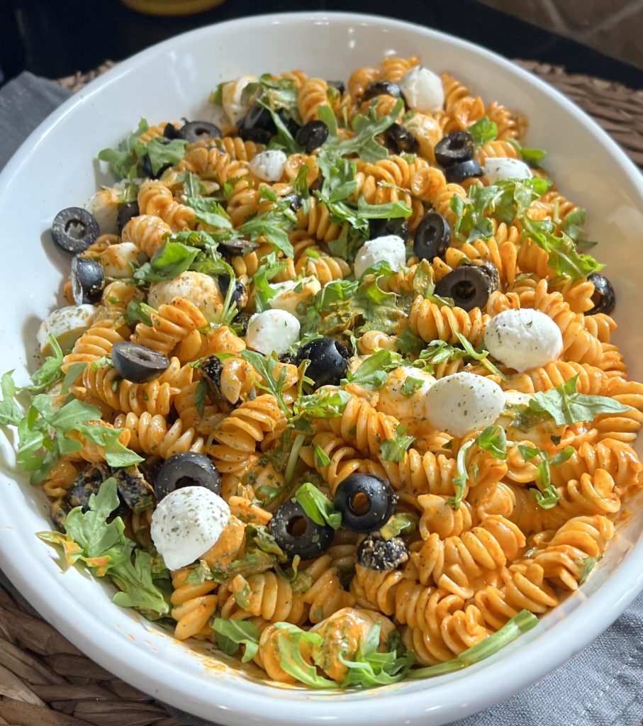 This isn’t your ordinary pasta salad. What makes it extraordinary? The dressing. This pasta is tossed in a roasted red pepper puree that’s been transformed into the creamiest, most flavorful dressing you’ve ever tasted. Mixed with sliced black olives, the cutest mini mozzarella pearls, and my newest favorite addition, a handful of fresh, peppery arugula, it’s a vibrant, easy-to-make dish that tastes as good as it looks.