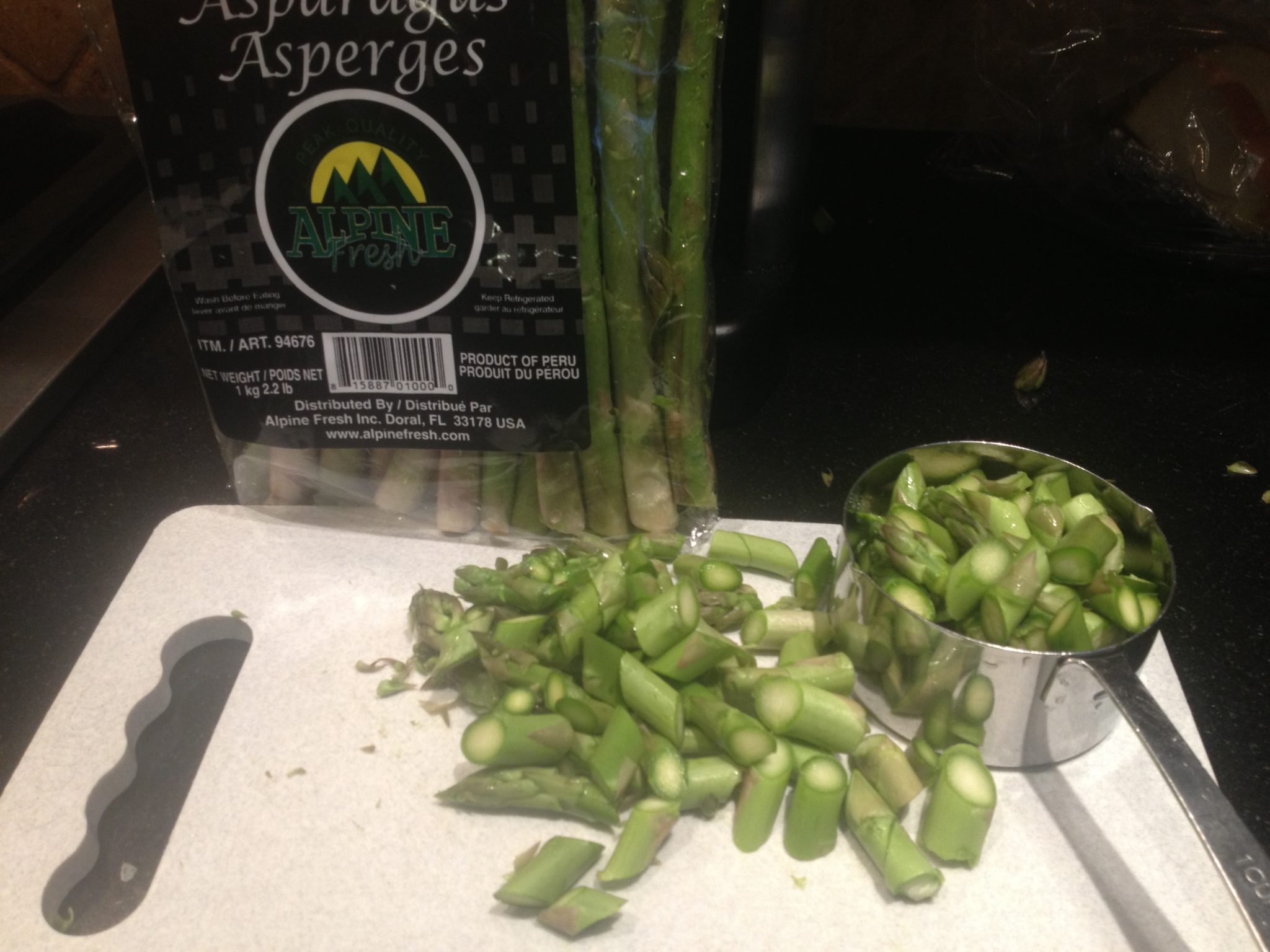 First, slice the asparagus and sauté in olive oil. Then remove the asparagus to a covered dish. Then add the onions and garlic and sauté until translucent. At this point add the quinoa and coat through the olive oil for abut 5 minutes or so.