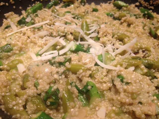 If your like me and cramming at the gym before the summer solstice arrives, then I have a great recipe for you. While I still plan to pump a few extra tons of iron and tread a few extra thousand miles on the tread mill, I am going to do so while eating good healthy food. Thats what I love about this Quinoa and Asparagus Risotto. It’s not only beach body friendly – it’s good for you too!