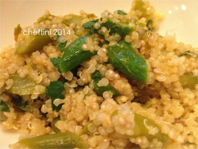 Take the pan off the heat, cover and set aside a few minutes. After a few minutes the quinoa will become creamy. Then add the asparagus spears and parsley. Stir all together and serve.