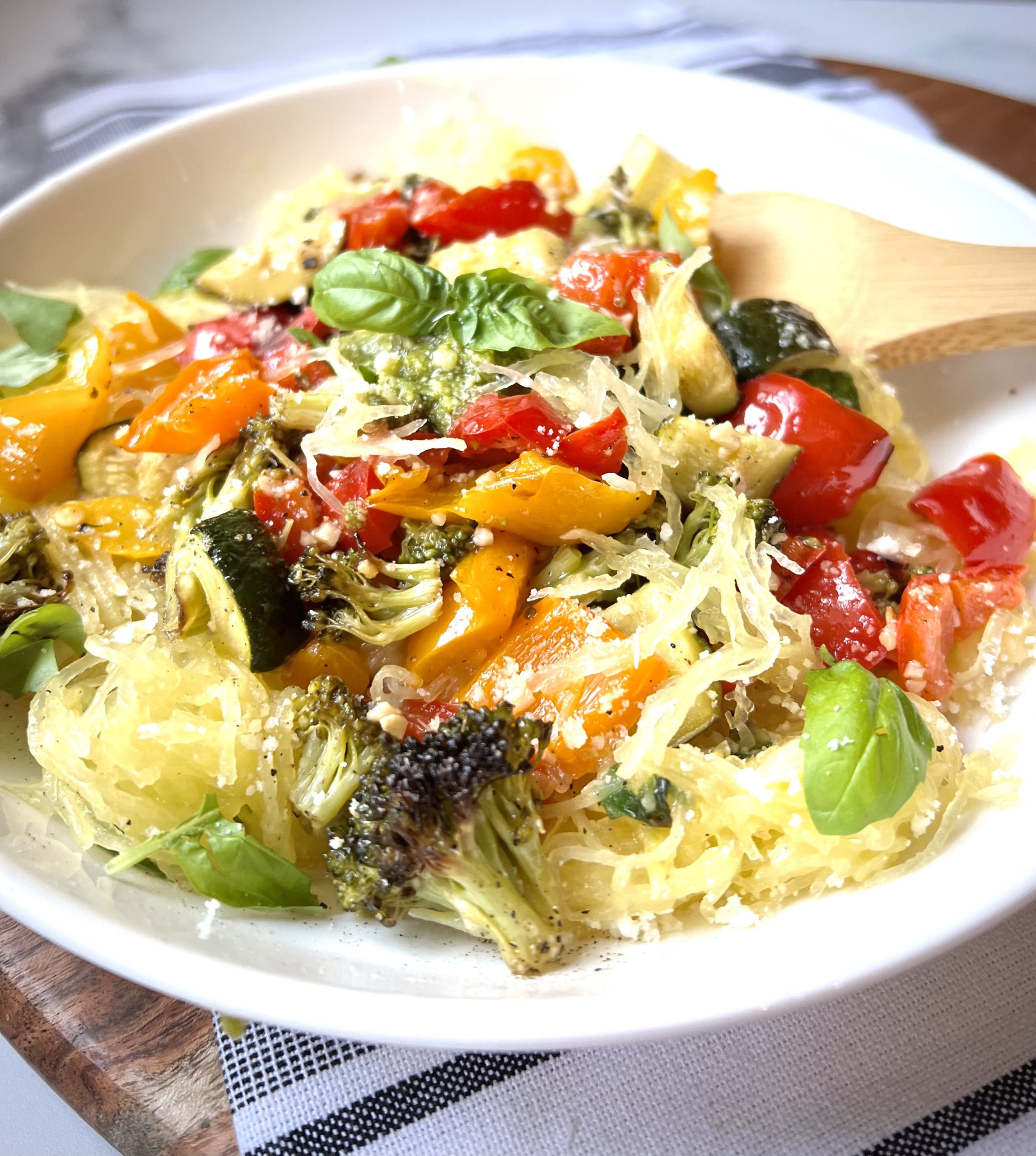 Another option, is to place the spaghetti squash strands back onto the sheet pan and then toss together with the vegetables, basil and grated parmesan (less clean up this way!).