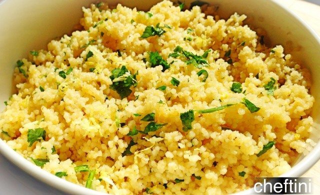 Using a 1:1 liquid to couscous ratio bring your liquid, lemon juice and extra virgin olive oil to a boil and then remove from the heat. Pour in the couscous, give a good stir and cover for about 5 minutes. Remove the lid and add the lemon zest and parsley and then fluff with a fork. Serve as a simple side dish with your favorite meat or fish.