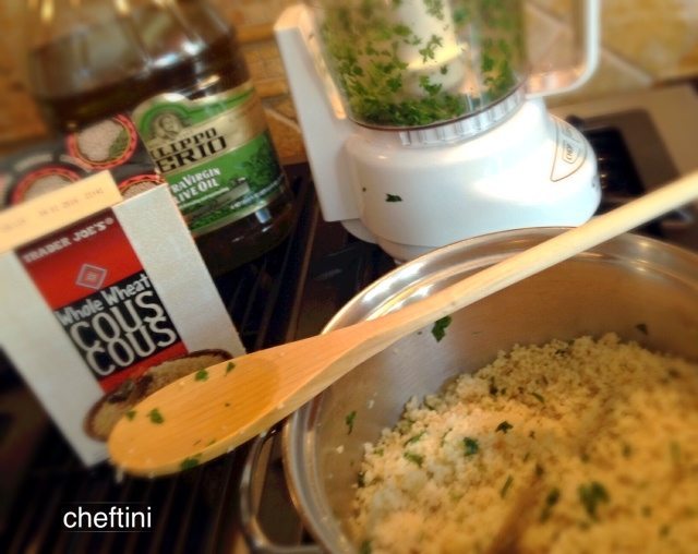 The ingredients needed to make this simple side are: whole wheat couscous; the juice and the zest from one fresh lemon, some fresh chopped parsley, chicken stock (or even plain water) and a little extra virgin olive oil.