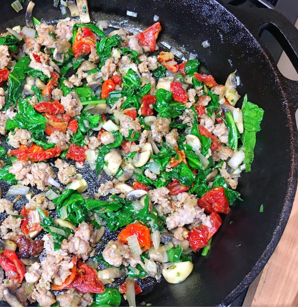 - Heat skillet with a tablespoon or so of olive oil, sauté sausage in pan until cooked through. Set aside. Sauté mushrooms and shallots for 3-4 minutes then add chopped sun Dried tomatoes and spinach. Season lightly with sea salt until spinach begins to wilt. Remove from pan into a covered bowl.