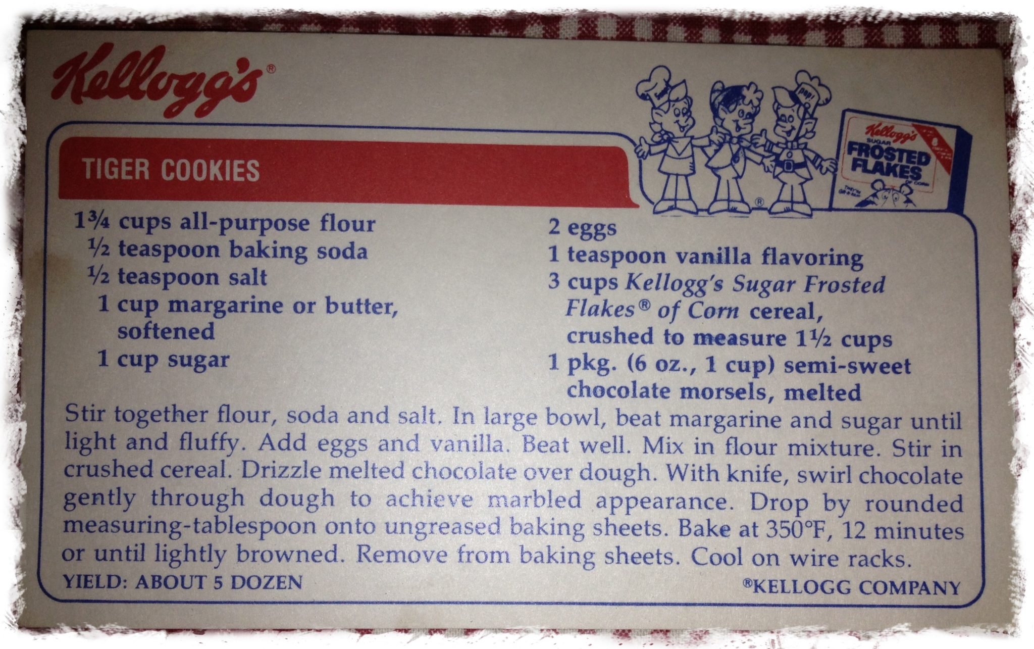 Recently, I came across this old Kellogg recipe card for Tiger Cookies – made using Frosted Flakes. Thought it would be a fun throwback recipe to make with the kids.